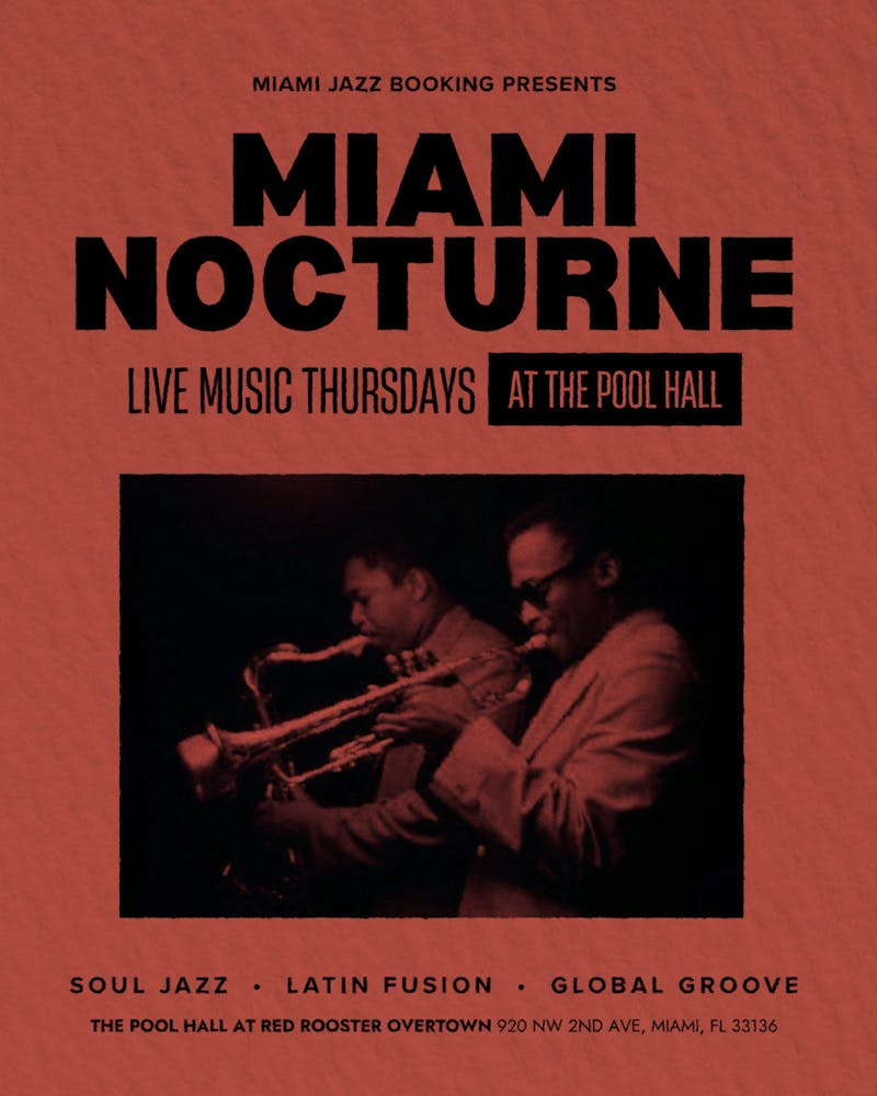 Introducing Miami Nocturne — a new weekly series presented by Miami Jazz Booking, every Thursday night, live from The Pool Hall at Red Rooster Overtown, spotlighting Miami’s finest alongside international touring artists shaping the sound of our city after dark.