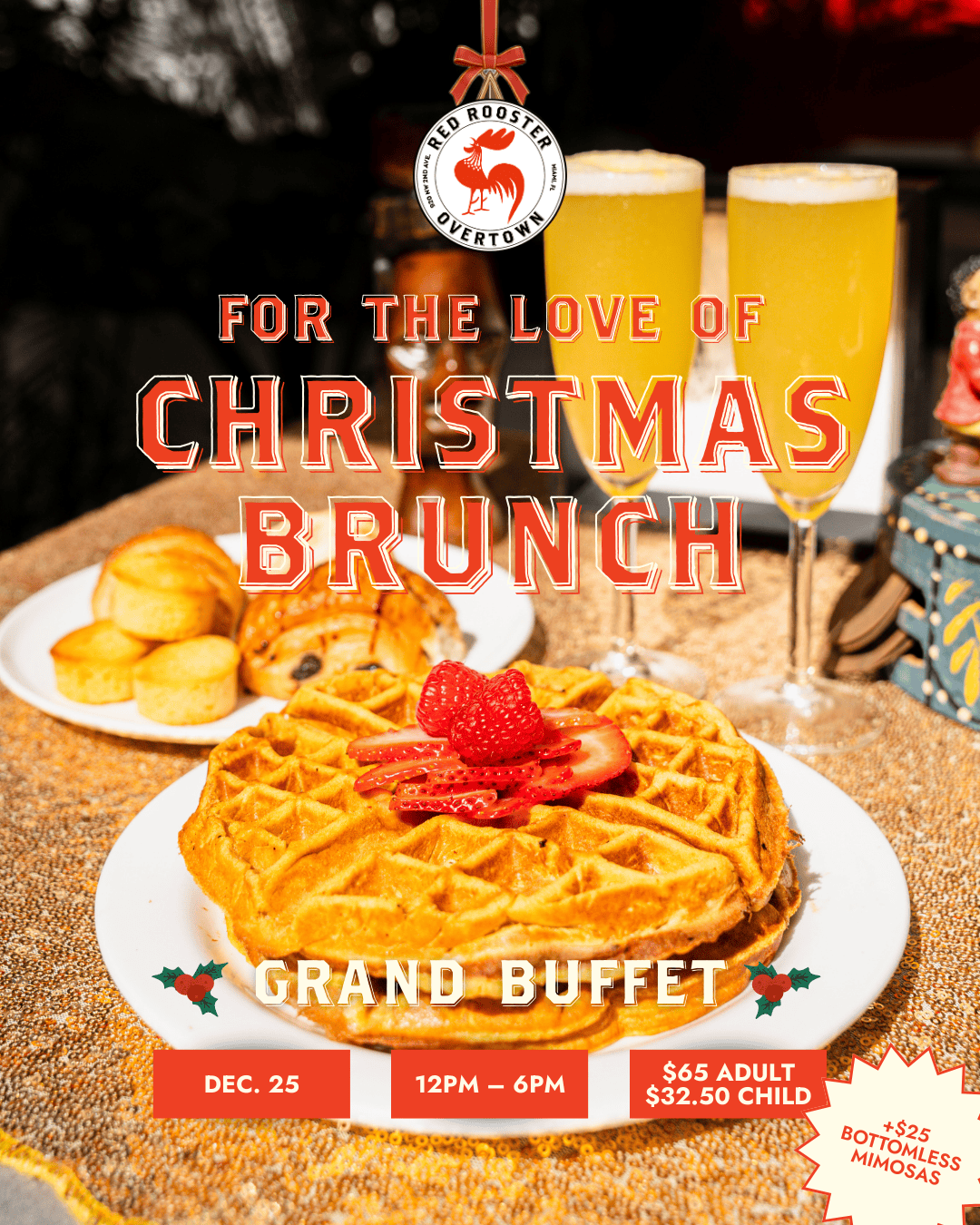 Join us on Christmas Day for a special holiday edition of our world-famous “For the Love of Brunch” buffet. Enjoy unlimited access to chef-curated stations featuring soul food favorites, fresh seafood, made-to-order specials, sweet treats, and Red Rooster classics. Bring your family, gather with neighbors, and celebrate the season with a joyful, abundant brunch experience in the heart of Overtown.