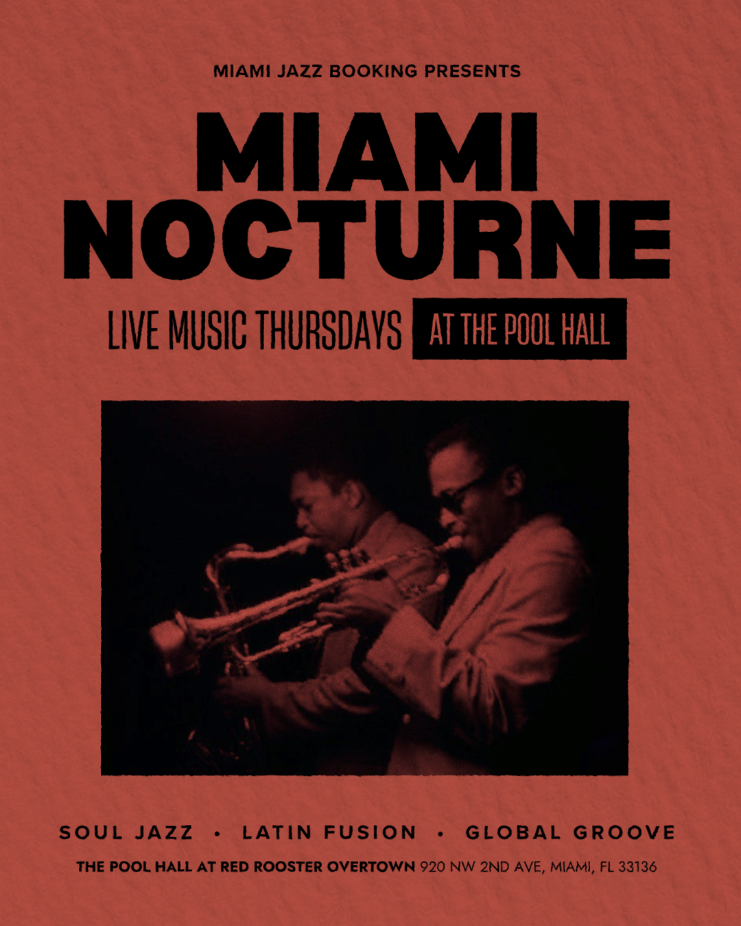 Introducing Miami Nocturne — a new weekly series presented by Miami Jazz Booking, every Thursday night, live from The Pool Hall at Red Rooster Overtown, spotlighting Miami’s finest alongside international touring artists shaping the sound of our city after dark.