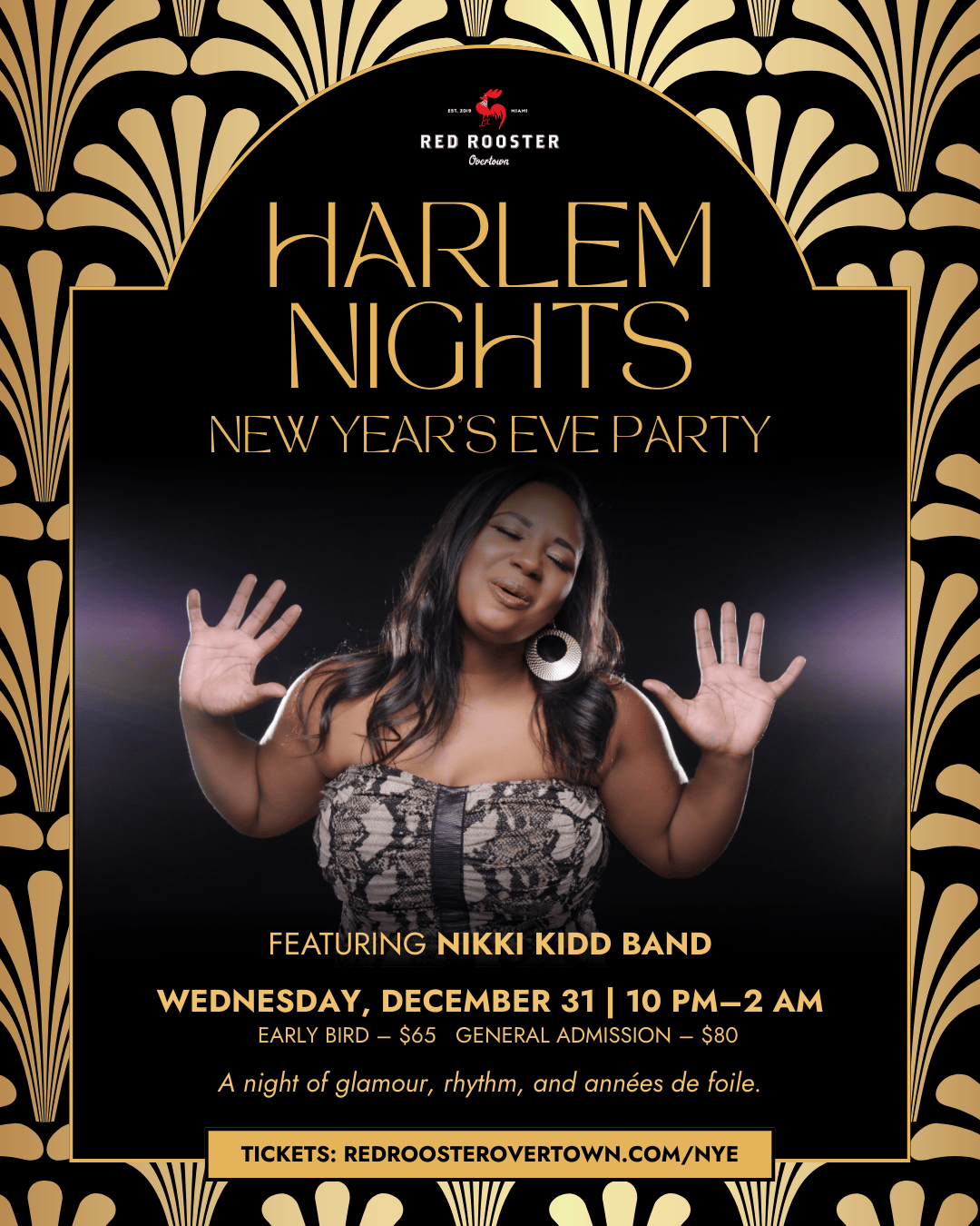 Slip into Downtown Miami’s most historic NYE celebration with live music, swinging Harlem sound, and 1920s glamour inside the speakeasy above Red Rooster Overtown.